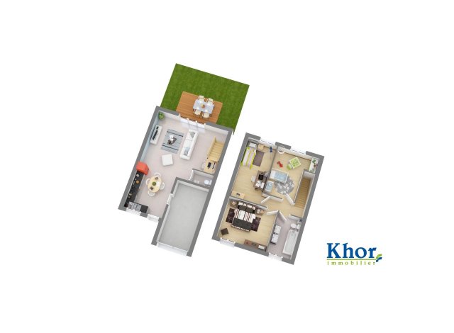 Maison jumelées de 85 m2 comprenant entrée, salon/séjour sur cuisine ouverte, toilette, garage. A l'étage : 3 chambres, salle de bains avec WC.